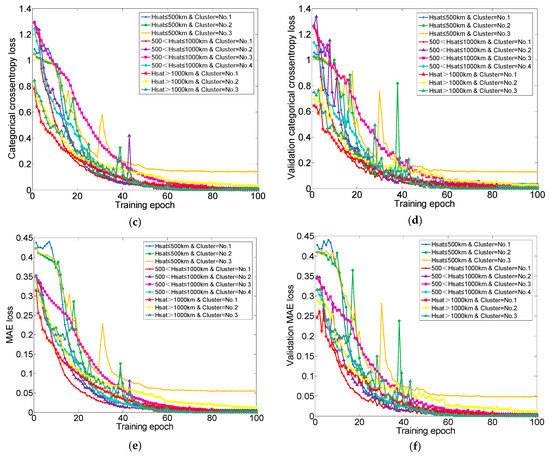 Training records of 100 epochs based on different training dataset. (a) Training accuracy; (b) Validation accuracy; (c) Categorical crossentropy loss of training set; (d) Categorical crossentropy loss of validation set; (e) MAE loss of training dataset; (f) MAE loss of validation set.