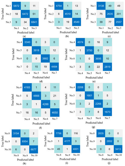 Confusion matrices of untrained data tested by the following training model. : (a) ; (b); (c) . :(d) ; (e) ; (f) ; (g) . : (h) ; (i) ; (j) .