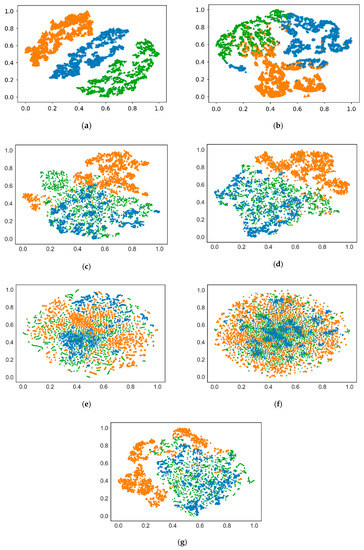 Although the classification results of LSVM could prove the feature extraction validity of GRU neural network in some aspects, it is still expected to further display the distribution of extracted features for these seven recognition methods. Therefore, dimension reduction visualization technology is employed in this paper, which can map high dimensional feature data to two or three dimensions. At this time, the distribution of extracted features can be seen intuitively. Figure 13 shows dimension reduction distribution of features extracted based on one cluster training data () for these seven methods. It can be found in Figure 13a that the GRU neural network has the best feature distribution result because the dimension reduction features of three satellites are separated from each other. However, other methods have more or less intersections between different satellite classes, especially the last five methods. It is confirmed that the features extracted by the GRU neural network are more effective and highly discriminative.