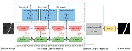 The aforementioned models relying on fully convolutional networks have significantly contributed to the state-of-the-art techniques, but all of them still lose some useful features from middle layers. In order to utilize the characteristics of the middle layer to the best of one’s ability, we exploit the approach in holistically-nested edge detection []. Holistically-nested edge detection (HED) mainly solves two problems. One is the end-to-end training and prediction, and the other one is multiscale and multilevel feature learning. Through their architecture, the authors not only complete the prediction from image to image, but also perform edge detection by the learned rich hierarchical features from middle layers. A single stream deep network with multiple side-outputs was considered for multiscale learning, by which the authors highlight the importance of obtaining edge maps. The side-output layers were then interpolated behind encoder unit which encourages coherent contributions to improve the accuracy. It can generate predictions from multiple scales, but there is no significant redundancy of both representation and computational complexity.