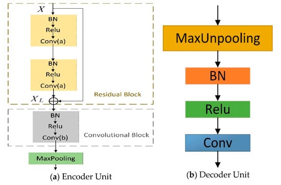 Most architectures, particularly designed for segmentation, have an encoder network and a corresponding decoder network [,,]. The former, learning rich hierarchical features of input data, is composed of classification networks’ modules, such as VGG [], GoogLeNet [], and ResNet []. These classification networks achieve good results for dealing with recognition tasks. Among them, ResNet have proved its superiority in several challenging recognition tasks, such as ImageNet [] and MS COCO [] competitions, and the number of semantic segmentation networks by means of residual building blocks is increasing. He K. et al. [] investigated and analyzed the residual building blocks by a series of ablation experiments. These experiments, emphasizing the key role of skip connections and the importance of their identity mappings, supported the idea that keeping a “clean” information path is helpful for making the optimization easier. Based on these experiments, our encoder unit use “full preactivation unit”, proved to perform better than the baseline counterparts.