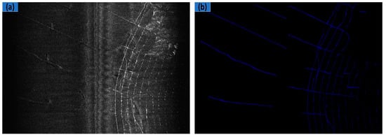 The ground truth for images is essential to use supervised method for SSS image segmentation. We used LabelMe, an image annotation tool developed by the MIT, to manually label images. In the corresponding ground truth image (shown in Figure 5b), the blue and the black color denote the object and the background areas, respectively.