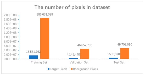 In addition to analyzing some challenging factors in the dataset, the number of target and background pixels in the dataset were also compared, shown in Figure 7. There is a clear serious category imbalance in the dataset, which brings huge challenges to the model performance.
