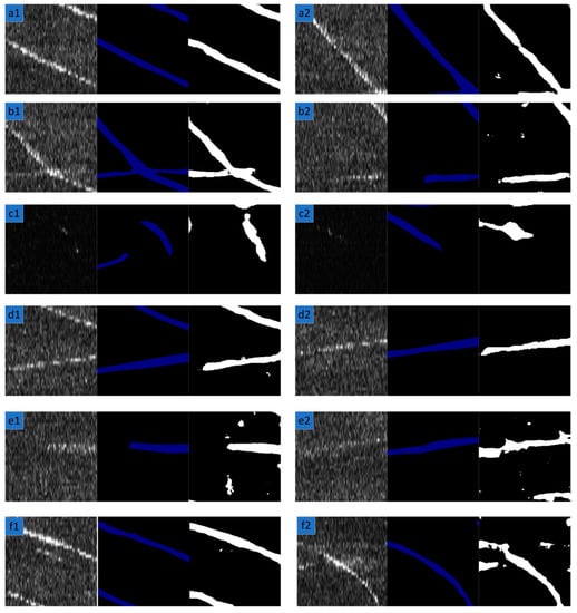 The test results on different data in the test set. From left to right, the images are the original SSS images, their corresponding ground truth and prediction results, respectively. Row1 (a1 and a2): clear and standard. Row2 (b1 and b2): some target pixels are obvious and others are weak. Row3 (c1 and c2): dark. Row4 (d1 and d2): discontinuous. Row5 (e1 and e2): weak and unclear. Row6 (f1 and f2): strong noise.