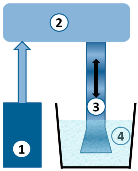 Scheme of the ultrasound device. 1—ultrasound generator, 2—magnetostrictive transducer, 3—waveguide, 4—vessel with water.