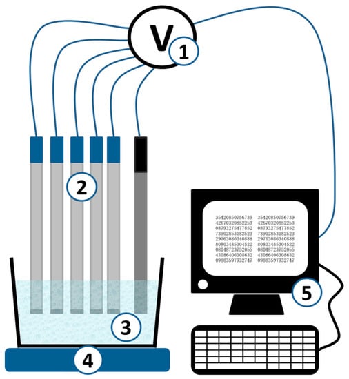 Potentiometric multisensor system. 1—multichannel digital mV-meter, 2—meter, 3—cell with sample, 4—magnet stirrer, 5—personal computer.
