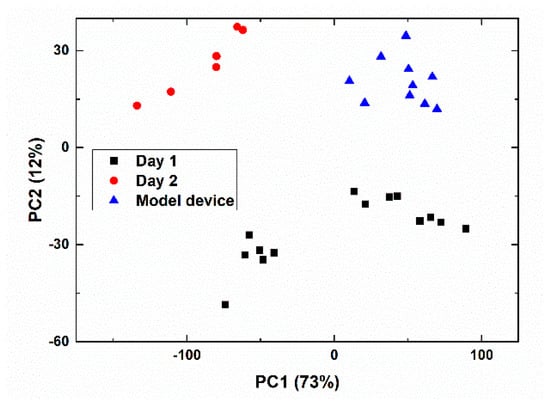 First, we performed sample recognition using principal component analysis (PCA). The loading plot representing sample mapping based on similarities and/or differences of the response of multisensor systems in these samples is shown in Figure 3.