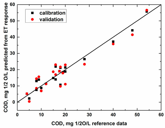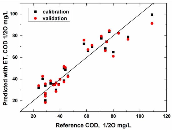 The PLS algorithm was applied to calculate the values of COD, ammonium, and nitrate nitrogen and phosphorus in the samples. Figure 4 shows such results for COD, while the pictures for the other parameters were pretty similar.