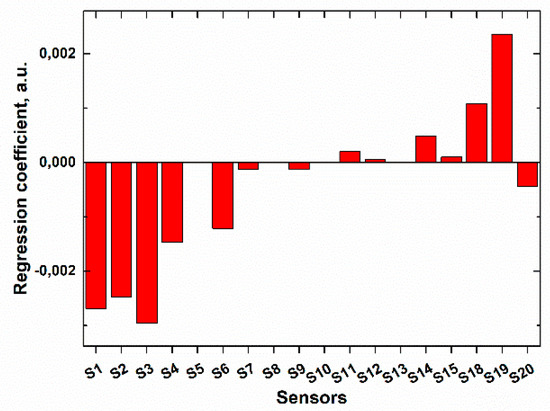 It was proven by calculation of the regression coefficients (Figure 5) that the response of the multisensor system towards sodium hypochlorite was stipulated by the sensitivity to chlorine-containing anions in solution (sensors S1–S6), rather than to sodium (or any other) cations (sensors S7–S15). The redox response of chalcogenide glass sensors (sensors S18–S20) included into the sensor array was also quite informative in this case.