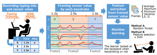 Figure 1 shows an outline of our proposed method. Learners wear JINS MEME (https://jins-meme.com/) eyewear while carrying out typing training to detect whether the learner looks at the keyboard for each keystroke by machine learning. The JINS MEME is a wearable device that can measure electrooculography (EOG), acceleration (Acc.), and angular velocity (Gyro.), and has a possibility to measure the learner’s eye gaze and head movements. EOG is measured through the electrodes equipped at the nose pad in a simple way. A gyroscope and acceleration sensor are built in the temple tip position. Sensor data obtained by JINS MEME are composed of a four-axis EOG, three-axis acceleration, and three-axis angular velocity.