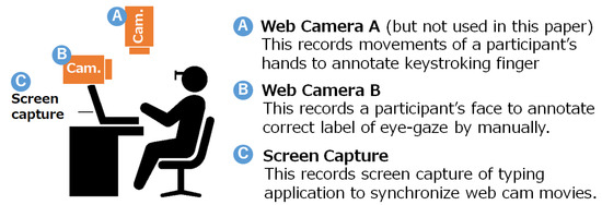 Interactions have been proposed in which a learner’s gaze is detected to determine whether the learner is touch-typing. By applying these methods, an application can visualize the learner’s weaknesses and advocate not looking at a keyboard. Arai et al. [16] proposed a gaze detection method using a face picture of the learner; however, their method could not be used in real-time situations. Imamura et al. [17] also proposed a real-time gaze detection method using a face picture of the learner taken by USB camera. In addition, some studies have been conducted using a web camera to detect eye gaze [18,19,20]. Simple web camera use has become widespread in recent years; standard laptop PCs are commonly equipped with a web camera. Web camera usage is useful as an eye gaze detection method. Zhang et al. [18] proposed an appearance-based accurate eye-gaze detection method in the wild that achieved approximately a 6-degree error for gaze detection, even when evaluated by leave-one-person-out cross-validation. Sewell et al. [19] identified a disadvantage of the camera-based gaze detection method, namely, that detection can be affected by the user’s head movement because the web camera is commonly fixed on the PC or monitor. Furthermore, the camera-based gaze detection method presents invasion of privacy risks.