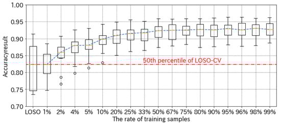 Accuracy comparison between the rate of training samples. These box plots consist of the experimental results of 10 subjects. Because the number of training samples for each subject is about 900, 1% of training samples equals about nine samples.