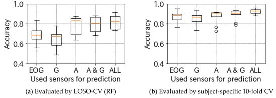 To verify the effect of features extracted from the EOG sensor, we additionally analyzed performance evaluation. Figure 5 shows the results determined by our method using features extracted from each sensor. The “A” indicates features extracted only from the accelerometer, “G” is gyroscope, “EOG” is electrooculography, “A & G” is the accelerometer and gyroscope, and “ALL” includes features extracted from all sensors. Regardless of the evaluation method (LOSO-CV or user-specific 10-fold CV), ALL features achieved the highest accuracy rates, resulting in the best performance. Although A & G accuracy also indicates relatively better performance, ALL is slightly superior. Comparing the mean value and the standard deviation, A is 74.2 ± 18.8%, A & G is 75.0 ± 18.5%, and ALL is 77.1 ± 18.9%, when evaluated by LOSO-CV; when evaluated by subject-specific 10-fold CV, A is 86.9 ± 6.7%, A & G is 89.1 ± 5.2%, and ALL is 92.5 ± 2.5%. These results show that EOG features slightly affect accuracy, and our method using JINS MEME determined subjects’ touch-typing behavior by head movement and eye gaze comprehensively.