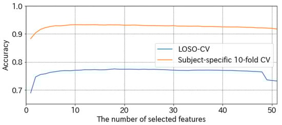 Table 3 shows the selected features. Because LOSO-CV used the same features between each subject, we showed the selected order in the table. In contrast, because subject-specific 10-fold CV selected features by each subject, we counted the frequency for each feature, and we showed the 12 most frequently selected features. In subject-specific 10-fold CV, the selected feature is especially different for each subject; further, it tends to look different from LOSO-CV. We considered that this is the cause of the decline in accuracy when our method could not use the subject’s own data in the training phase.