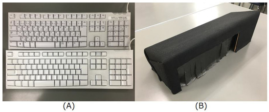 To determine touch-typing difficult keys for each subject, we prepared special environments where a subject must do touch typing, and asked subjects to perform typing tasks. We prepared two special experimental environments where subjects would not be disturbed during typing to the degree possible, namely, that the environment did not hit the subject’s hands, and that the environment did not obstruct screen view. To create one environment, an original blind keyboard was painted white with a spray as shown in Figure 7A. In Figure 7, we placed a common keyboard adjacent to an original blind keyboard to make it clearly understandable. These two keyboards were the same model types, with a slightly different texture as a result of the added paint spray on (A). Protrusions indicating typing home position on the keys F and J were confirmed to be the same on the painted and unpainted keyboard surfaces. The other environment was created by covering a keyboard with a black box as shown in Figure 7B so the subject was unable to look at the keyboard. The subjects placed their hands in the box from the front. In addition, the top plate of the box was made diagonal so as not to block screen view.