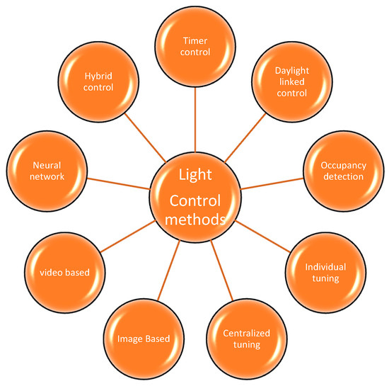 Based on the previous work in lighting control by different authors around the world, light bulb control was found to be achieved by nine methods: timer control, daylight-linked control, occupancy detection, individual tuning, centralized tuning, image-based, video analytics, neural network-based control and hybrid control (Figure 1). Timer-based light control system were designed to set the status of light bulbs based on a preprogrammed time [8]. Daylight-linked control systems [9,10,11] were devised to operate by evaluating the daylight illuminance. The system design involves daylight availability, intensity evaluation and the assessment of daylight values. Based on the illuminance of daylight, dimming of light bulbs is performed. The two aspects required in daylight-linked systems are photosensors and dimming of light bulbs. Dimming affects the power quality of light bulbs [12]. In daylight intensity estimation, photosensors play a major role. The problems faced by photosensors are the distribution of daylight and artificial lighting in the space in which they are placed; the absence of explicit guidelines for the setting, positioning and commissioning of the photosensor; the spectral composition of lighting; the ambient light intensity and the field of view [13]. A decision-making technique [14] capable of identifying the best photosensor placement with variable field of view was analyzed based on three criteria. The three criteria were lighting levels between ceiling and working plane, lighting capability and energy savings. In a daylight control system, various parameters [15] were calculated and the energy savings were proved to vary in different places and under different conditions. Occupancy detection control is modeled by checking the motion or presence to trigger the light bulbs. This can also be implemented with vacancy sensors. Various occupation detection methodologies were presented in a review of occupancy sensing methodologies [16,17]. In conditions where occupants stay active for all time, dimming is found to save more energy [18]. Individual tuning [19,20] is adjustment of the light intensity level to the user’s comfort which is categorized as personal tuning. This control technique was selected by single users. In centralized tuning or institutional tuning [21,22] a cluster of light bulbs is controlled by location or building- specific conditions. In image-based control the luminance was calculated by the image captured by a low cost camera [23], CMOS low resolution camera [24] or CCD camera [25]. In video analytics-based control [26], lights in places like underground garages were controlled by video analytics. Artificial neural networks, deep learning techniques and machine learning are the most recent methods deployed to control the light [27,28]. When one or more of the above discussed techniques [29,30,31] are combined, they form a hybrid control technique.