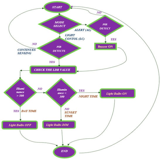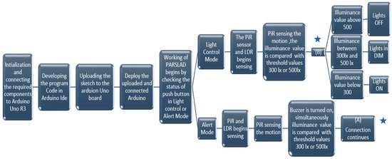 An Arduino UNO [37,38] R3 board is the heart of the circuit. The light dimmer module has AC input and an AC load port along with Vcc, ground, gate and SYNC pin. In certain models, SYNC pins are denoted as ZC or PWM pin. The gate and SYNC of the dimmer light module are connected to the 7th and 3rd pins of the Arduino Uno, respectively. The light dimmer works based on the zero crossing detector and opening the triac after a delay that gives a dimming effect to light bulbs [39]. The relay has six pins, with the signal pin connected to the 10th pin of Arduino Uno board and C and NO pin given to the control device. The PiR sensor has three pins and the output pin is connected to the 2nd pin of the Arduino Uno board. A LDR is connected between the power and the A0 pin. A push button and the buzzer are assigned to the 13th and 5th pin of the Arduino. All the components are supplied power through a 5 V pin and are grounded to the GND pin. Figure 2 and Figure 3 illustrate implementation and methodology of PARSLAD with an Arduino board, respectively.