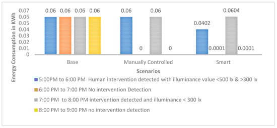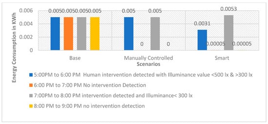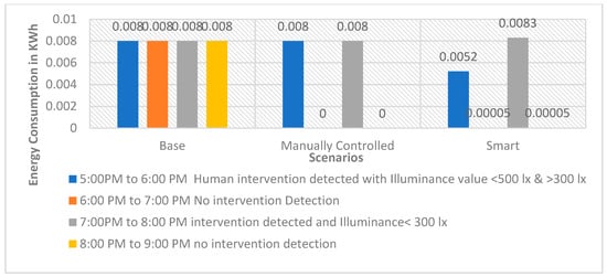 Figure 5, Figure 6 and Figure 7 clearly show the increased energy consumption at 7:00 pm to 8:00 pm when intrusion is perceived in the absence of the prescribed daylight distribution. This upsurge in the smart scenario is due to the power expended for the operation of device along with ON state of light bulb. The energy upshot meant for one hour is adjustable when bearing in mind the reduction of power consumption in the four hours instance of 60 W incandescent and 8 W LED light bulbs. Nevertheless, in the case of a 0.5 W LED bulb, the smart scenario consumes more energy during the monitored four hours. Thus, the number of light bulbs controlled by a PARSLAD device is increased for the purpose of demonstrating the efficiency of the device.