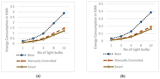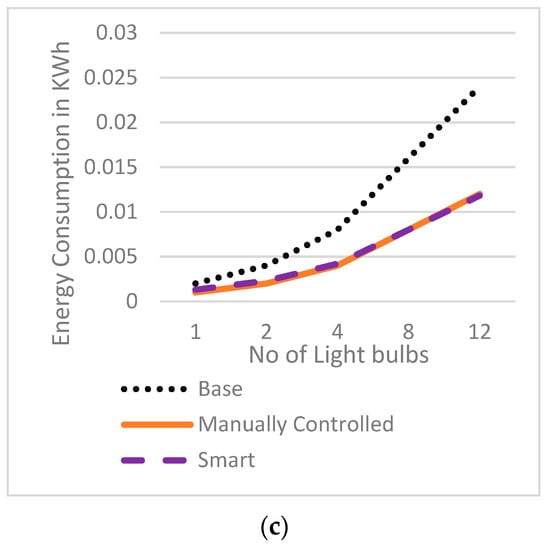 Details of the power consumptions seen in three scenarios for different numbers of bulbs are given in Figure 8. Figure 8a,b, show the smart scenario of 60 W incandescent and 8 W LED light bulbs as having the lowest consumption in all the cases. Figure 8c shows the smart scenario of a 0.5 W LED light bulb as having less consumption when compared to the base for all the cases, but it also shows a reduction in the energy consumption in the smart scenario for a 0.5 W LED light bulb in comparison to the manually controlled scenario from eight bulbs. Thus, the authors’ proposed model consumes less power for any number of light bulbs for both incandescent and LED light bulbs, but for very low power watt bulbs like 0.5 W, the power is reduced only when it is deployed with eight or more than eight bulbs. For less than eight light bulbs, the consumption of power for smart and manually controlled scenarios was almost the same. As the proposed work can be deployed in any indoor or outdoor lighting application, it is customary to have more than eight LED bulbs if it is only a low wattage for effective use for the low power solution.