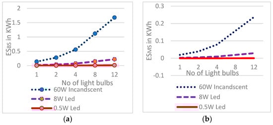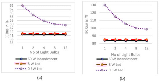 Energy consumption ratio vs. number of light bulbs for: (a) Comparison of ECRBS of 60 W incandescent Light, 8 W LED and 0.5 W LED light bulbs and (b) comparison of ECRMS of 60 W incandescent Light, 8 W LED and 0.5 W LED light bulbs.