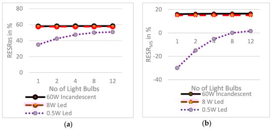 Figure 10 shows a plot of the RESR parameters against the number of light bulbs. Figure 10a,b, display the increase in RESRBS and RESRMS with an increase in the number of light bulbs.