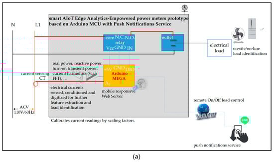 Proof-of-concept demonstration of the described cloud analytics-assisted electrical EMS architecture with the presented AI-embedded and Arduino MCU-based smart power meter prototype, the smart AIoT edge analytics-empowered power meters prototype based on Arduino MCU, as edge analytics for on-line load monitoring as load identification in DSM in this work. (a) Sketch of the designed and implemented prototype installed in a practical environment for an electrical network topology and used as a smart electrical outlet/wall socket. (b) Experimental set-up of the presented prototype in the described architecture in the realistic laboratory environment. (c) Electrical EMS web control: the mobile responsive web server configured on the Arduino MEGA 2560 MCU mounted with the Arduino W5100 ethernet shield and wired with a relay for remote on/off load control.