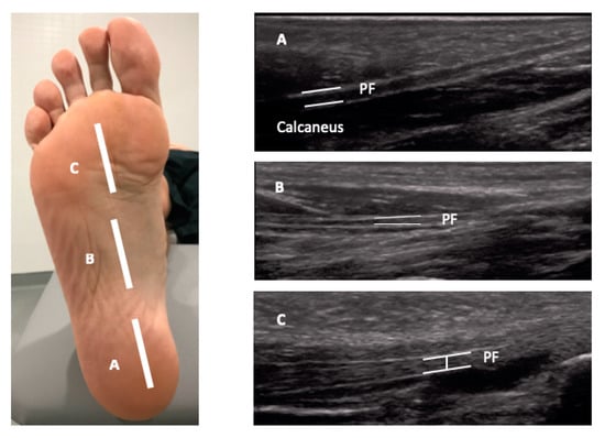 The PF is a soft tissue structure across the plantar foot and provides an important role in ankle and foot biomechanics, being a structure capable of working with greater loads by modifying its thickness and stiffness []. For example, Huang et al. [] reported changes in the thickness of the PF in individuals with pes planus, related to mechanical load changes.