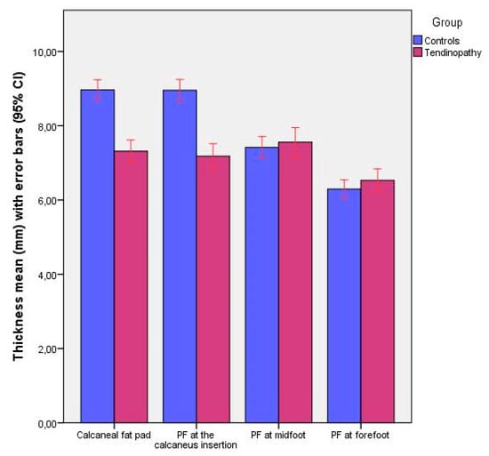 CFP protects the rear-foot from the stress produced during the initial phase of locomotion and the heel-strike actions. CFP thickness was described as a valid and reliable method to quantify and assess the heel fat pad by USI []. Several authors argued that CFP has been implicated in foot and plantar disturbances, such as diabetes [], fractures [] and plantar heel pain []. To our knowledge, this is the first study to evaluate the CPF thickness in patients with AT. The results of our study showed a decrease in CPF thickness in the tendinopathy group, so it could be considered a relevant variable for the diagnosis and management of individuals with AT.