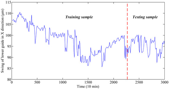 To verify the effectiveness of the proposed model, the experiment was carried out in the Ertan Hydropower Station in China. The S8000 monitoring system was installed [4], which is made by Shenzhen Strongwish Co., Ltd. (Shenzhen, China). It contains a data acquisition and monitoring substation (NET8000) and central server (WEB8000). The NET8000 acquires the raw signal with sensors and conducts network communication. It can collect up to 4 key phase signals, 24 vibration signals, 12 static signals and 255 process signals obtained by MODBUS communication. The WEB8000 can store and manage the data from NET8000. The general structures of HGU is illustrated in Figure 3, where the location of sensors is shown in on the right. The BENTLY3300 sensors were mounted on the lower guide to obtain the swing data. The sensor is a kind of electric eddy current sensor of the 3300 series, whose output is 4–20 mA or 1–5 V. Its frequency response range is 0–10 kHz and the linear range is 2 mm, average sensitivity is 200 mV/mil [50].