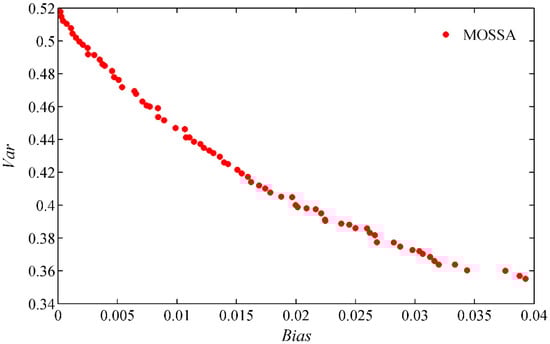 In this paper, the effectiveness of the prediction model should be simultaneously evaluated by the prediction accuracy and stability. Therefore, the bias-variance indexes are utilized as the fitness functions of MOSSA [30,31]. The value of represents the precision, which indicates the difference between the true value and the predicted value.