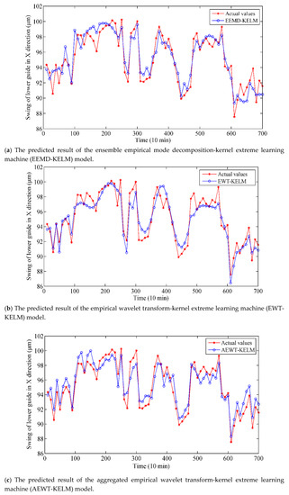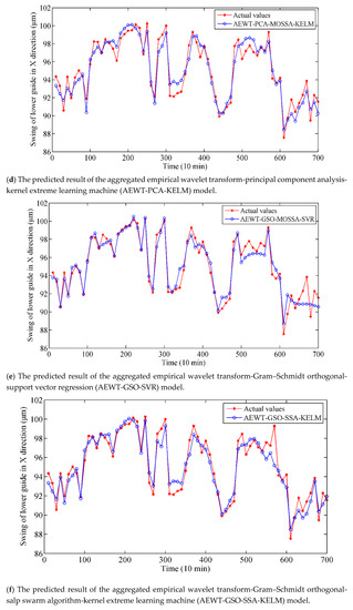 Overall, it is obvious that the prediction curve of the proposed model matches the actual curve best. In contrast, the other models do not fit well with the actual vibration trend. For the SVR-based model, some points of the output are almost divergent in Figure 8e.