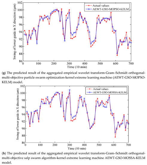 Comparisons of vibration data and prediction results with different methods: (a) EEMD-KELM model, (b) EWT-KELM model, (c) AEWT-KELM model, (d) AEWT-PCA-KELM model, (e) AEWT-GSO-SVR model, (f) AEWT-GSO-SSA-KELM model, (g) AEWT-GSO-MOPSO-KELM model, and (h) AEWT-GSO-MOSSA-KELM model.
