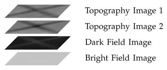 Each image stack consists of four images showing the exact same region of the wafer back surface. The images have a size of 21 pixels × 21 pixels. Figure 1 shows an image stack containing a star crack as an example. From the top to the bottom we have two topography images, a dark field image, and a bright field image.