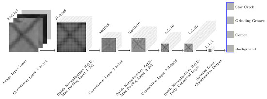 Accordingly, we define a simple convolutional neural network architecture (Figure 3) on our own and train it from scratch on our image stacks. This simple convolutional neural network consists of 15 layers. The image input layer specifies the input image size with 21 pixels × 21 pixels and 4 channels. Then we have three convolutional layers each followed by a batch normalization layer and a nonlinear activation function layer. The first convolutional layer consists of 8 filters, the second one of 16 filters, and the third one of 32 filters. All filters have a kernel size of 3 pixels × 3 pixels. For each convolutional layer, the stride and the padding is set to ‘1’. The batch normalization layers between each convolutional layer and the following nonlinear activation function layer reduce the sensitivity to the network initialization and speed up the training. For the nonlinear activation function layers, we use rectified linear units (ReLU). The first two convolutional layers additionally have a max pooling layer after the ReLU layers. Max pooling layers remove redundant information and reduce the spatial size of the feature maps. They return the maximum value of a 2 pixels × 2 pixels region. For each max pooling layer, the stride is set to ‘2’ and the padding is set to ‘0’. Hence, the feature map is reduced to 10 pixels × 10 pixels by the first max pooling layer and the second one reduces the spatial size to 5 pixels × 5 pixels. In our network, the convolutional and down-sampling layers are followed by one fully connected layer. This fully connected layer combines all the features learned by the previous layers to assign the images to one of our four classes. The output of this classification layer is normalized by the subsequent SoftMax activation function. The output of this SoftMax activation function are positive values summing up to one, which are used as classification probabilities. These classification probabilities are used by the final classification layer to assign the input to one of the four classes: Background, comet, grinding groove, or star crack.