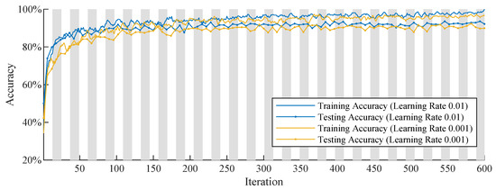To determine a suitable learning rate as well as the maximum number of epochs, we train the simple convolutional neural network with different learning rates over 50 Epochs in the first step. Overall, we compare the training progress plots with learning rates of 0.1, 0.01, 0.001 and 0.0001. However, to present a clear graphic, Figure 4 only compares the best two training progress plots with a learning rate of 0.01 and a learning rate of 0.001. The training and testing accuracies are depicted on the y-axis. The training accuracies are smoothed with a moving average filter with a span of 5. The x-axis shows the number of iterations. The background stripe pattern in the plot marks the different epochs. From this plot we derive that we get a slightly better performance with a learning rate of 0.01 and that we can set the maximum number of epochs to 20, since testing accuracy improvement is minor from around the 14th epoch onward.