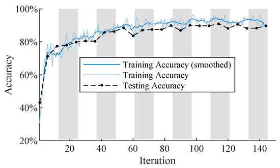 Hence, we continue to train the simple convolutional neural network once, with the fixed learning rate of 0.01 and a maximum number of 20 epochs. Additionally, we define the network stopping criteria with a validation patience of 5. The training progress plot (Figure 5) shows the training and testing accuracy on the y-axis. Additionally, we plot the smoothed training accuracy applying a moving average filter with a span of 5. The x-axis shows the number of iterations. The background stripe pattern in the plot marks the different epochs. The plot shows that the stopping criterion is met after 144 iterations achieving a testing accuracy of 89.7%. The total training takes around 90 s on a single i5 CPU using MATLAB [28].