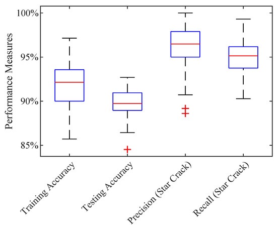 Due to the short training time, we can repeat the training hundred times to obtain the distribution of the classification performance. The boxplot (Figure 6) shows from the left to the right the training accuracy, the testing accuracy, and the testing precision and the testing recall of the class star crack on the x-axis. The y-axis depicts the performance measures in percent. This plot shows that our first training attempt, reaching a testing accuracy of 89.7%, lies around the median. Consequently, much worse or better results are possible. Furthermore, the plot shows that the precision and the recall of the class star crack are better than the overall testing accuracy. This is important for us, since we focus on correctly detecting all image stacks containing a star crack.