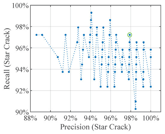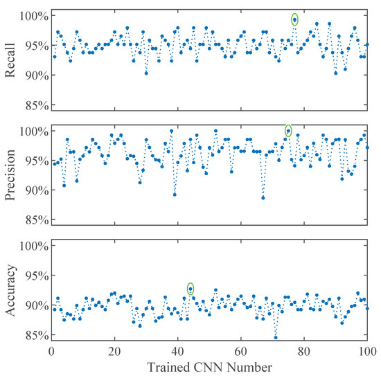 For the classifier comparison we select four of the trained simple CNNs for further comparisons in this work. The net with the best precision, the one with the best recall, and the net with the best compromise between precision and recall of the class star crack, as well as the net with the best overall accuracy. Figure 7 shows the performance measures plotted on the y-axes in percent and the number of the trained convolutional neural network on the x-axes. The lower boxplot is generated from the testing accuracy of the trained CNNs and the circle marks the net ‘CNN 44’ which has the best overall testing accuracy. The middle plot as well as the upper plot show the precision and recall rates of the class star crack, respectively. The nets ‘CNN 75’ with the best precision and the net ‘CNN 77’ with the best recall of the class star crack are marked with circles too. The net ‘CNN 20’ with the best compromise between precision and recall of the class star crack is marked with a circle in Figure 8, which plots the precision against the recall rate of the class star crack.