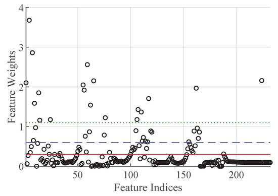 The following feature selection reduces the dimensionality of our data set. We apply the neighborhood component feature selection only on our training data set. Figure 9 shows the assigned weights of the 232 extracted features. The feature indexes are depicted on the x-axes and the corresponding feature weights on the y-axes. The horizontal lines mark the three different feature subsets which we use to train the SVMs. For each feature subset the features below the corresponding horizontal line are neglected. The dotted line indicates the feature weight threshold 1.1, the dashed line the threshold 0.6, and the solid line the threshold 0.3. We determine these feature weight thresholds based on the cross-validation performances of our target support vector machine with a quadratic kernel. A preceding 10-by-10 repeated cross-validation comparison of SVMs with a linear, a quadratic, a cubic, and a Gaussian kernel revealed that the one with the quadratic kernel shows the best performance.