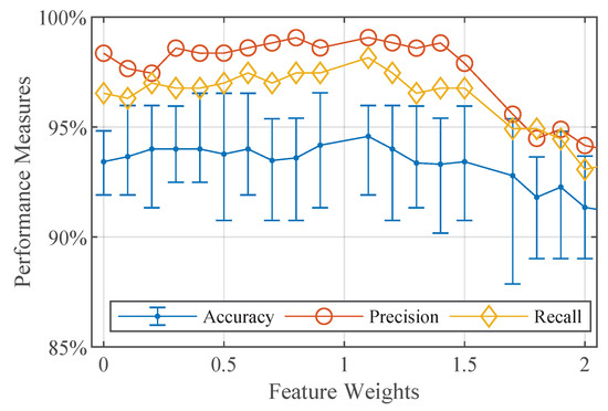 For selecting the feature weight thresholds, we analyze the performance curves of the quadratic support vector machine using 10-fold cross-validation (Figure 10). The mean performance measures of the classifier are plotted on the y-axis. For the overall accuracy curve, we additionally depict the error bars. The x-axis shows the features sorted in descending order according to their weights derived from the neighborhood component feature selection. We start with cross-validating the quadratic support vector machine with all extracted features and neglect step by step features below a certain weight with a step size of 0.1. Analyzing the obtained performance curves let us identify the feature weight threshold of 1.1 for the first feature subset. With this feature sub set we achieve the highest accuracy and the highest precision and recall of the class star crack. Additionally, we select the feature weight threshold of 0.6 for the second feature subset and the feature weight threshold 0.3 for the third feature subset. The first feature subset consists of 19 selected features, the second one of 36 selected features, and the third one of 62 selected features. We use these selected feature subsets to train quadratic SVMs and compare their performance.