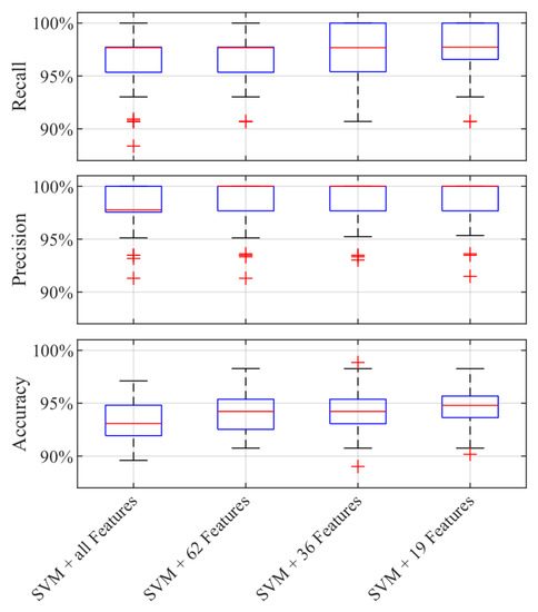 To compare the performances of the quadratic SVMs trained on the different feature sub sets in detail, we perform a 10-by-10 repeated cross-validation for each sub set (Figure 11). The x-axes show the tested quadratic SVMs with the different feature sets. The first SVM is trained with the whole feature set consisting of all 232 features. The second SVM is trained on 62 selected features, the third one on 36 selected features, and the last SVM is trained on just 19 selected features. The y-axes depict the boxplots of the performance measures. The lower boxplot is generated from the accuracy values of the tested classifiers and the middle as well as the upper boxplots show the precision and recall rates of the class star crack, respectively. These plots reveal that the performances of all feature sets are comparable. Hence, we will use the quadratic SVMs trained on the whole feature set and on the selected 19 features for the performance comparison on the test set.