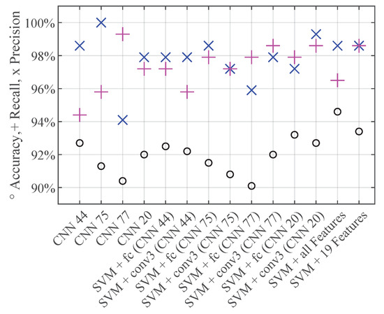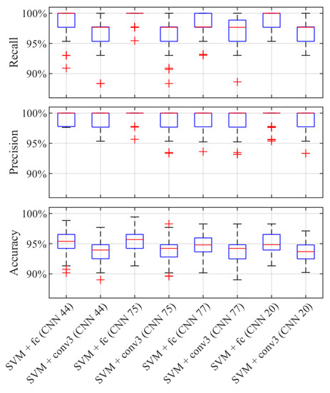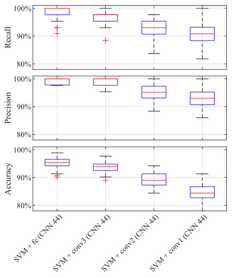Hence, we continue with evaluating these last two feature layers of our four selected simple CNNs. Figure 13 shows the 10-by-10 repeated cross-validation results of the quadratic SVMs trained on features extracted from the fully connected layer and the third convolutional layer of our selected trained simple CNNs. The first two SVMs are trained on features extracted from ‘CNN 44’, which is the trained simple CNN yielding the best overall accuracy. The second two SVMs are trained on features extracted from ‘CNN 75’, the one with the best precision. The third two SVMs are trained on features of ‘CNN 77’, the one achieving the best recall. The fourth two SVMs are trained on features of ‘CNN 20’, this is the net with the best compromise between precision and recall of the class star crack. This analysis shows that all trained SVMs are comparable regarding their performance.