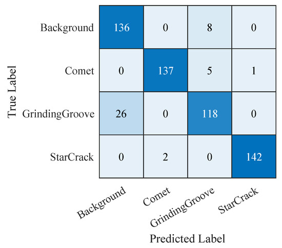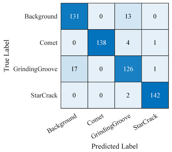 Figure 17 shows the confusion matrix of ‘CNN 20’ applied on our test samples. It is the trained simple convolutional neural network with the best compromise between recall and precision of the class star crack. This CNN also correctly classifies 140 star cracks out of 144. Here, one star crack is wrongly classified as background region, two star cracks are wrongly classified as comets, and one star crack is wrongly classified as a grinding groove region. Hence, this results in a recall rate of 97.2% of the class star crack. The regarding precision rate of the class star crack is also 97.9%. Here, one background region, one comet, and one grinding groove region are wrongly classified as a star crack. The overall accuracy is 92.0%.