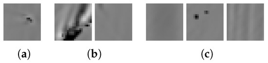 Figure 18 shows the topography images of all star crack image stacks of the test set, which are wrongly classified as comets, grinding grooves, or background regions. Analyzing these samples allows us to draw two conclusions. The first is that there is some overlap between weak signals of star cracks and signals of comets or grinding grooves (Figure 18a,b). The second conclusion is that the CNN model misses a typical star crack and predicts it as a background region (Figure 18c, first image).