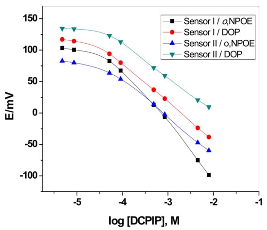 For each carrier, membrane sensors (n = 4) were prepared and the performance characteristics were evaluated during 6 months according to IUPAC recommendations []. For optimizing the membrane composition, the effect of plasticizer was tested. The response characteristics of ion-selective sensors were influenced by the polarity of the plasticizer in the membrane. 2,6-DCPIP PVC matrix membrane sensors incorporating ([Cu(neocup)2][DCPIP]2) (sensor I) or (MB/DCPIP) (sensor II)with (DOP, ɛ = 8) and (o-NPOE, ɛ = 24) plasticizers were prepared and tested. For the ([Cu(neocup)2][DCPIP]2) membrane-based sensor, the slope and detection limit were decreased from −82.2 ± 1 to −56.2 ± 1.7 mV/decade and from 7.9 × 10−5 to 2.3 × 10−5 M upon using (DOP, ɛ = 8) instead of (o-NPOE, ɛ = 24). In addition, the calibration slope and lower limit of detection of (MB/DCPIP) membrane based sensor were −59.5 ± 1.4, −51.6 ± 2 mV/decade and 4.5 × 10−5, 3.4 × 10−5 M upon using o-NPOE and DOP plasticizers, respectively. It can be seen that membranes containing DOP gave more favorable lower detection limits and wide range of linearity than those containing o-NPOE plasticizer. The calibration curves of the previous sensors are shown in (Figure 3) and the performance potentiometric characteristics are listed in Table 1.