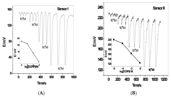 Responses of the proposed sensors using DOP as a plasticizer for (A) sensor I and (B) sensor II.
