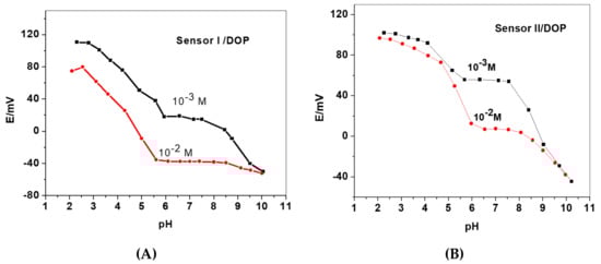 Effect of pH on the potentiometric response of (A) sensor I and (B) sensor II using DOP as a plasticizer