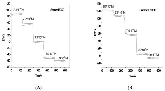 The dynamic response time of ion association complexes-based sensors was examined by measuring time to reach a steady and stable potential using 10-fold different concentrations of standard 2,6-DCPIP solutions (Figure 6). The response time of the proposed sensors was <20 s to reach ~95% of equilibrium response for 1.0 × 10−3–1.0 × 10−5 M 2,6-DCPIP solution.