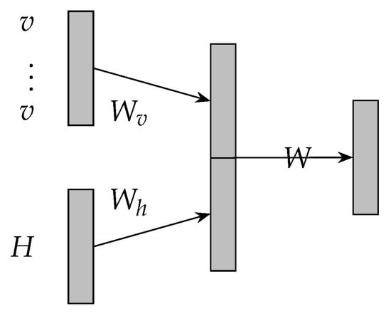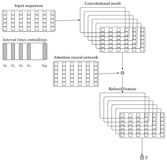 Attention mechanism is implemented by constructing a glimpse network according to the corresponding tasks and has recently demonstrated success [13,14,15,35]. The attention mechanism in literature [13] is over the input images and adaptively select a sequence of regions of the input images and only process the selected regions. In our work, the attention mechanism is over the convolutional results and adaptively select a sequence of regions of the convolutional results and only process the selected regions. The attention mechanism of the proposed model is illustrated in Figure 3 and its transition functions are described in Equations (4)–(6). Where matrix H denotes the convolutional results illustrated in Figure 2. is the embedding of the interval time. Vector denotes the attention weights to matrix H. Matrix r denotes the element-wise multiplication between matrix H and . Specifically, based on an interval time aspect, attention mechanism allows the proposed model to attend over matrix H based on an interval time and may effectively extracts the features in matrix H.
