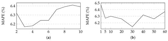In this section, we experimentally determine hyperparameter based on the validation set. l, the length of an input sequence and , the number of the kernels of the convolution compnent. The hyperparameter values is determined in a certain range as follows: l in and in . Figure 4 describes the variety of the MAPE with parameters l, increasing. The optimal values of l and are 3 and 30, respectively. The optimal learning rate of the parameters for AdaGrad, , is 0.1. Table 3 describes the hyperparameter values that are used in our experiments.